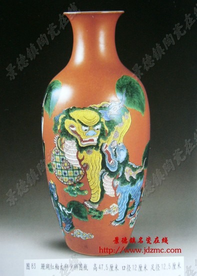 图83为民国珊瑚红釉太狮少狮图瓶,此纹饰为清代传统纹饰之一,以狮谐师。太师古代官名,为三公之位最尊者,周代始置,辅弼天子治理天下。少师古代官名,为三孤之一,周代始置,亦为辅弼天子之官,地位次于太师。此器纹饰有康熙官窑之风,线条流畅,绘画精细,体格健壮,填彩之后用墨点饰。鬣毛如卷云,尾毛似绣球,惟凶猛威武的神态不及康熙。但较晚清同类题材的民间色彩及装饰味仍有很大区别。底青花双圈“大清康熙年制”楷款。