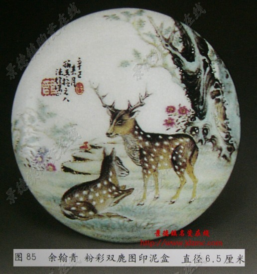 图85为余翰青1941年粉彩双鹿图印泥盒,在直径6.5厘米的印盒面上,作者绘有一卧一立双鹿,虽笔法不及方云峰之作细腻真实,有传统鹿纹的影子,但皮毛及梅花斑点亦非晚清笨拙体态白彩点饰之作可比。左边墨书“辛巳春月抚元人法于珠山”丛红彩印章两方。印盒底外壁墨书“伯作宝篇,子厂孙孙永”篆籀文及行书“翰青书”,另有红彩白文“画印”一枚,底红彩方框“翰青”楷款。