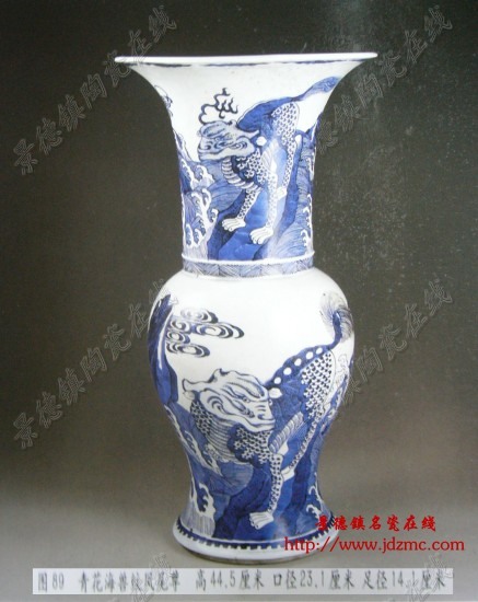 图88为粉彩豕狼图瓶,口沿处饰——周蓝料回纹,下为璎珞纹饰,足外墙亦饰一周回纹。画面构图饱满,一只恶狼在原野上追逐一只肥猪,体态一瘦一肥,色泽一黑一褐,下为皴擦而成的洞石,上为勾线渲染的松树,背景开阔。狼猪有西洋笔法,衬景则为中国传统画韵。背面墨书“豕性钝为首,狼形恶为贪”及“乾隆御览之宝”、“仁化”、“世宁”、“碧露”红彩印章四枚。底“乾隆御制”楷款。 海兽为明代艺人杜撰之兽,明清两代瓷器上多见此兽。民国海兽纹饰多承袭清康熙民窑风格。图89为青花海兽纹凤尾尊,外壁分上下两组海兽纹饰,中以细密的几何条纹相隔,海兽凶猛威武,肌肉隆起处有细密均匀的鳞甲。与康熙民窑作品相比较,绘画不甚工细,特别是尾毛以细密的线条代替渲染。头部生动气韵不足,略显呆滞。青花色泽泛紫,层次感稍差。即便如此,仍不失为较成功的仿前朝之作。