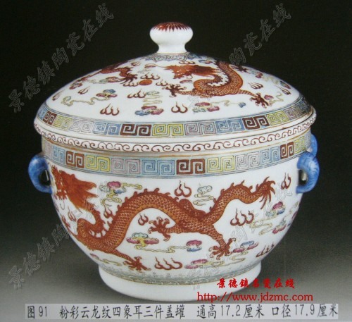 图91粉彩云龙纹四象耳三件盖罐,盖面边饰、罐口沿边饰均为红、黄、蓝、粉四色回纹, 色彩艳丽,古意浓郁。近足处为一周海水纹,勾描细腻,色彩淡雅。 器心为红彩团龙纹。主题纹饰为红彩行龙,加饰五彩祥云。纹饰仿乾隆风格,但勾描略显生硬,只是与晚清同类纹饰相比较则细腻一些。底红彩双框“洪宪年制”楷款,为民国云龙纹饰器物中的精细之作。