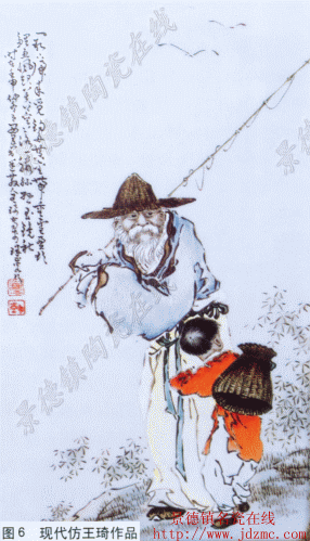 一是王琦的人物画在乾隆粉彩的基础上,结合自己早年画瓷像的技艺,又吸收西洋画法,人物头部刻画细腻,以西画手法描绘人物脸部,明暗关系清晰,神情捕捉准确,光影富于变化,有西洋绘画晕染技法,立体感强,被后世称为“西法头子”。而模仿者往往是略加晕染,缺少细腻;稍有光影变化,但明暗层次不足;人物缺少神情,若表情生硬的瓷上肖像画。