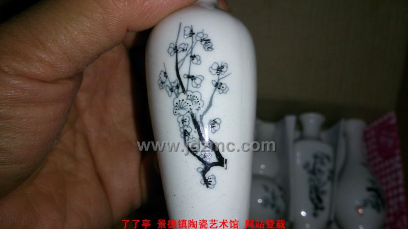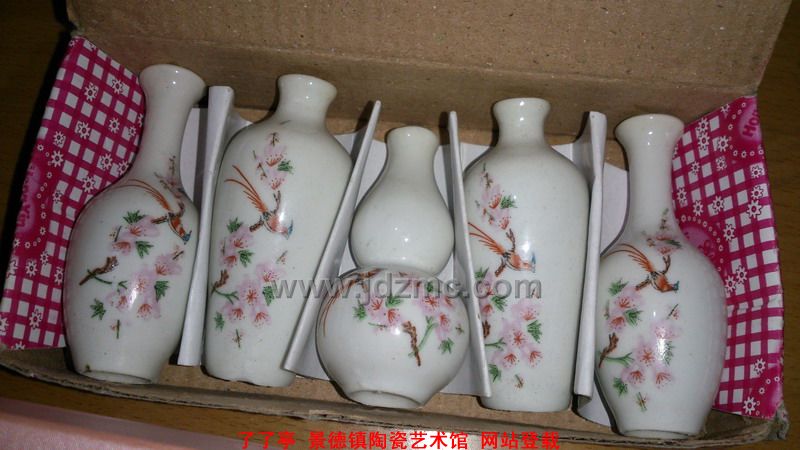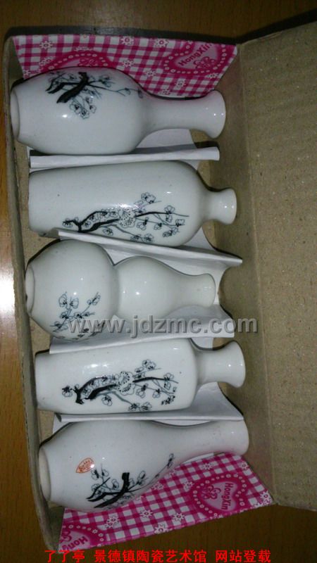 贴花清酒壶系列。釉中彩的贴花,这种釉中彩的贴花和釉下青花贴花不同,它是在成瓷后贴上釉中彩贴花,随后1250摄氏度