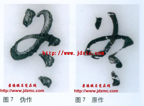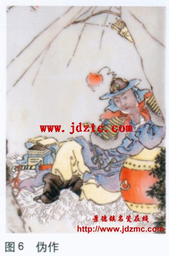 仿品所仿的印章,文字尚可,只是下方印章所绘边框粗笨不堪,多番修改,没有原作清爽利落。 仿王琦《木兰从军图》瓷板,所仿图样极为酷似,与原作比较,戗眼看来似乎一模一样,但经细心观察,亦终露出马脚。首先是仿品的笔触(图6),并不是王琦的“钉头鼠尾”笔法,尤其是木兰的衣褶及衣带的刻画,与原作比显得混乱无力。木兰所坐的毛皮,王琦原作表现了毛皮的柔软质感,仿品则只见胡乱曲线。