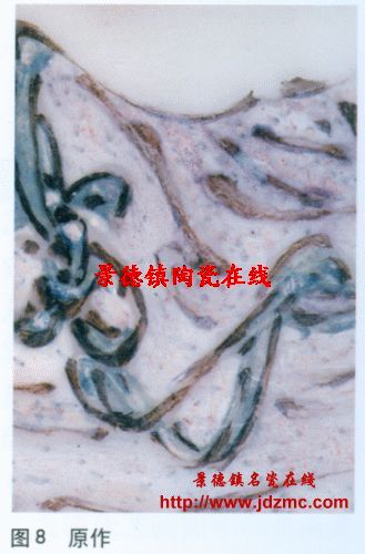 仿《木兰从军图》瓷板的最大破绽在书法上。仿品因为“有本可从”,于是力求模仿原作书法,刻意求似。但在显微镜之下,模仿书法却无所遁形,是用“双钩”法,先钩出字体轮廓,再用黑彩慢慢填空而成(图7)。衣服褶纹,每一笔画亦可见到全无笔触,慢慢临摹,欠缺笔力(图8)。因为瓷板光滑,并不吸水,笔触痕迹明显,比较绘画于纸、绢之上更易于分辨。