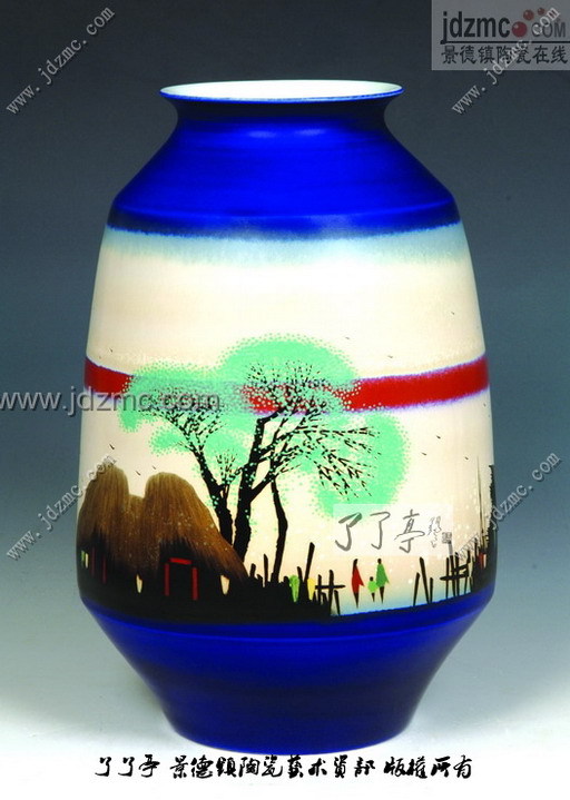 我和文贤算是半个老乡,三十一年前我作为知青下放在浮梁县兴田山区务农,文贤正是正德村的人。这个山村位处赣北皖南交界之地,人口不足一百,人均田亩不够三分,唯有满目的山峦叠嶂,松涛竹啸,是谓“石韫玉而山秀,泉怀珠而峰润”。1969年冬季,全省农村兴起“八字头上一口塘”的农田水利高潮。在方家坞水库建设工地上,我们一些有书画基础的知青奉命在工地上写标语、画宣传画。有一个约摸十一二岁的孩子,趿拉着布鞋,背着手缝蓝布书包,跟随着我们东奔西走,时而仰着头看大哥哥画画,时而俯着身瞧大姐姐配色。那稚气而聪慧的目光中,有惊羡的好奇,也有求学的渴望。虽是一言不发,却常收集我们丢弃的粉笔头、炭笔茬。后来,我们发现村里的一些门板上、土墙上,甚至在路亭的石柱上有一些胡乱涂鸦的小鸡雏鸭、举旗的战士、挥锄的农民等等。忍俊不禁之下,我们私下说,这山里伢子,或许将来就是一个赫然有名的大画家。 果不其然,时隔三十春秋,当年的山里伢子已是江西省工艺美术大师,山旮旯走出的不仅是一名大学生,而且还是一位陶艺家。他,就是现年五十岁的方文贤。 俗话说:“老乡见老乡,两眼泪汪汪”。三十年后的重逢相叙,有对蹉跎岁月的叹息,有对兴田乡土的留恋,有对故人旧事的评说,有对相互间境遇的关心。闲聊中我了解到,文贤高中毕业后,回到家乡务农两年多,一次偶然的机会,当上了小学民办教师,主教数学,兼授美术课程。1976年参加高考,本来是报考师范专业的,因简历中填有绘画的特长爱好,招生办通知他加试美术,结果被景德镇陶瓷学院录取,三年后毕业即分配在景德镇建国瓷厂,专事陶瓷美术创作设计。1992年调江西省陶瓷工业公司国家用瓷办公室工作。屈指算来,他在陶瓷艺坛笔耕也有三十多年的历史了。 我趁隙看了文贤创作绘制的一些陶瓷作品,那青花、那釉里红、那色釉综合装饰,抑或粉彩、新彩,无不情动于中而形于画。最令人心动的是,其山水、花卉、人物的情感元素,皆是“脉脉乡情寄笔端”。 瓷画乡情缘之于“乡土文化”的理解与深眷。“……在田野我常能看到农民在耕作,有时候他们当中一个人在会伸直了腰站起来,然后擦拭手。这就是有些人要我们相信的所有快乐又愉快的工作。至于我,我可以在那里得到真挚的人生与伟大的诗篇”。法国让·法朗索瓦·米勒对“乡土文化”的诠释,于脍炙人口的《拾穗》《播种者》画作证实其艺术魅力。文贤瓷画作品表象构成的主体后面,一直燃烧着一束松明式的火把,那就是作为陶艺家的他永远所讴歌土地、表现山野、揭示生活的题材,所关注的,永远是乡土本身、劳动本身,永远是家乡的父老乡亲带来的起伏的感情,以及由此不断在随时给人们的生活事业带来的愉悦。 文贤的瓷画如《金秋》《渔歌》《天高任鸟飞》等作品,运用青花、釉里红、高温颜色釉等材质性能及工艺,之所以能够至今仍依如当初一样动人心魂,感人至深,重要的因素之一就是因为土地文化是他绘画中一股汹涌、灵魂的潜流,而并非一般的展现或机械如摄影般的记录。土地塑了魂魄,血液里才能淌出画境的诗意。乡土文化只有被陶艺家心灵化以后,绘画才具有生命、具有活力、具有诚实的感染力。虽说文贤的作品里没有叱咤风云的将相,没有娇姿骚首的仕女,没有工笔写实的芳卉,也没有唐诗宋词的吟诵,但却能感受到田园的蔬笋气息。 延袤的深壑密林、山村的犬声雁影、水乡的渔歌牧笛,几乎都在其题材中仰仗、依赖乡土文化。我们只要仔细地品读,就一定会感染到那股“牲口粪与干柴混合的乡土气息,能在触摸的手指上轻染一层深秋后微白微腐犹如枯枝败叶上爽毛似的颜色”。我们时下尚没有能力用一两句话,把乡土型绘画作品的具体含义明确清晰地定义下来,但我们却能从文贤的瓷画中触摸到乡土文化遒劲的枝干;犹如走进乡村后看到秋后路边那霜染的红枫,雪霁后林间那冒尖的春笋,夏雨后山塘那初绽的小荷,春风下村后那随风飘曳的垂柳一样,感触到乡土的无处不在;听到游子对家乡土地的倾听,恰如民间音乐一样在我们耳边叮当作响,潺湲流动。正如“宫廷文化”支撑了被我们景仰的皇家御瓷一样,“乡土文化”在诸多文贤式的陶艺家的笔触下,其点、线、面的突变,则支撑了《山村雪韵》《桦林深处》《徽南民居》,也支撑了《秋晨》《贵北风情》《江南水乡》。古人曰:“载文以道,论贤于器”。当然,文贤的绘画并不像我们在上世纪60年代末那样被动地受政治形势所驱动,受“领导意识”所左右,而发之内心地发挥了热爱家乡、热爱土地、热爱生活的主观能动性,在陶瓷装饰领域里找到了绘画艺术的突破传统官窑瓷画原有局限的角度,找到了表达自我感受,表现生活的最佳形式,从而也从审美上解决了陶艺家从这一个体与社会文化之间的协调关系,找到了自我感情的个性语言,找到了张扬风格的形式和艺术载体。其中,瓷板画是景德镇陶瓷独特的一个艺术门类,它是手工压制成型,有立烧、平烧、吊烧三种烧制工艺。《江南水乡》主题表现在江南水乡秋色,装饰颜色主要有青花料、墨料、花釉和釉里红,绘制工艺为釉中。为了让色彩有自然流动感,该瓷板是采用立烧工艺,所以,整个画面色彩丰富自然。陶瓷绘画的笔势线描源之于中国绘画,书画艺术是中华民族文化之魂。《书画》装饰结合器型
