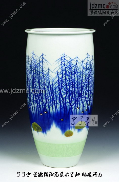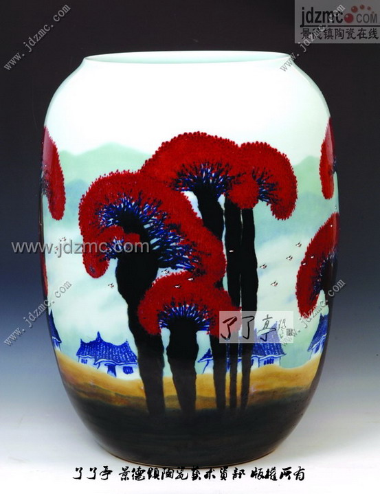 在陶瓷学院经过了系统陶瓷美术理论学习后,方文贤被分到了建国瓷厂美研组。在这个以高温颜色釉闻名的老国营瓷厂,方文贤如鱼得水。 方文贤为高温颜色釉所倾倒,这种神奇的色彩不断地诱惑他不停地进行尝试。不流动的颜色釉可以成为最绚丽的色彩,而流动的颜色釉则又可产生自然的机理效果,窑位的不同、施釉厚薄、吹釉方式都能让颜色釉的效果发生意外的变化。 这种意外让方文贤兴奋不已,他不停地试制照子,试图掌握颜色釉的规律,建国瓷厂每三天烧一轮的柴窑里都会有方文贤的照子和试验作品。 就像贾岛推敲诗词,方文贤则苦吟自己的陶艺,他的陶艺语言则是变幻的高温颜色釉。 在制瓷高手云集的建国瓷厂,方文贤还不断下到车间学习制瓷工艺,观摩老艺人拉坯、制坯,回来便琢磨器形和装饰如何更好地结合。 如此成长的方文贤在景德镇陶艺家中经历颇为特殊,因为他没有任何正式的师从关系,这也让他的陶艺自始就走上了自己的道路,即使有段时期囿于传统观念压抑,但他奋力冲破后,便找到了自己的一块天地。 唯一让他放不下的,是故乡的山山水水,即使是破败的茅屋、寂寥的山峦,都带着浓浓的怀念,这最朴实的画面勾勒出了方文贤深深的乡村寄情。 如今已成长为江西省工艺美术大师的方文贤仍毫不掩饰对乡村题材的迷恋,他的高温颜色釉结合青花、粉彩等装饰,描绘着一幅幅唯美的乡村小景。 有人说,方文贤的根在乡土。