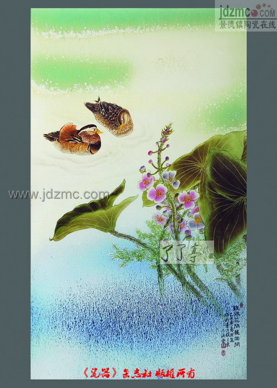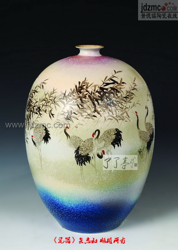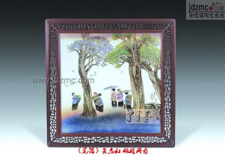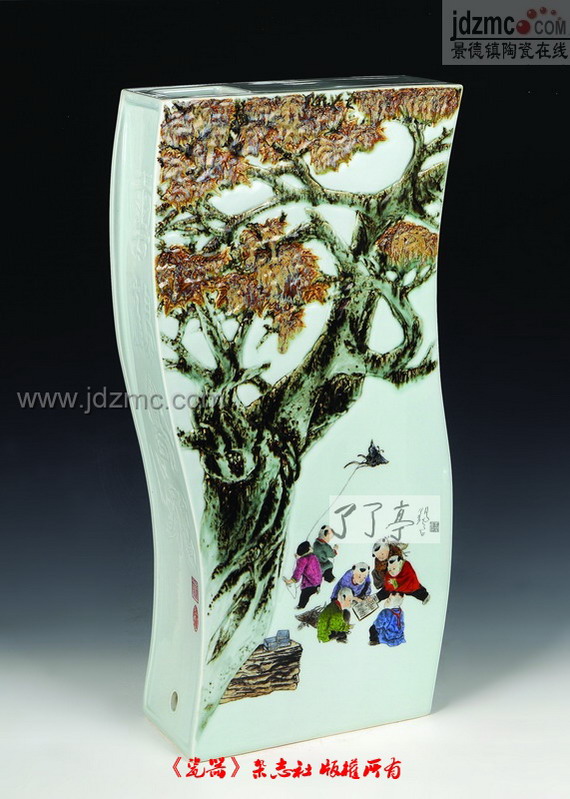 “秋望”作品采用色釉综合装饰手法,由高温色釉、雕刻、粉彩、新彩加以完成,整个构图给人格调高雅、考究之感,具有装饰性和时代感,有新意。在造型上打破传统镶器造型,且有动感。装饰为二面,其一表现对朋友再次相逢的一种期望,人物动态生动,以酒相送,依依惜别,神态感伤,寄情于景,让人释怀。另一面以琴抒发情感,其中妇女儿童都为之琴声而留步,聆听,表达了琴者对晚辈的希望,其中树形姿态、树叶的处理疏密得当,且有艺术效果,整个作品有瓷味,充满了诗情画意。 |