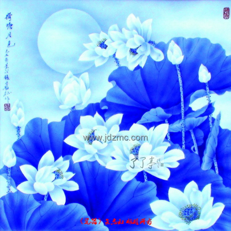 宁勤征:早在1985年至1987年,我在继承传统(釉上)刷花艺术的基础上就开发出独具时代感的现代刷花山水、花鸟系列作品,“给传统陶瓷艺术注入了一股清新的春风”(媒体评论)。十年磨一剑,1998年,我又迈出了更加独创性的一步———发明了釉下青花刷花,使山水、花鸟的创新有了史无前例的突破。作品细腻雅致,过渡自然,无论在工艺技法、表现手段、审美品味和艺术特色等方面,都填补了景德镇传统青花艺术领域一项空白。 釉下青花《荷塘月色》瓷板画,就是其中的代表作。这件作品首次参加杭州西湖博览会中国工艺美术精品大奖赛,就获得来自全国专家、教授的高度评价,一举夺得金奖。 刷花作品的创作,构思立意、布局必须立足工艺美术、在追求色彩美的同时,更要注重大气、简洁、概括的形式美,烘托出温馨、安详、宁静的氛围特点。现代刷花山水瓷画,综合地借鉴吸收油画、国画、水彩、木刻等艺术门类的优势和特点,以刷代笔,笔为补充,表现人与自然的和谐。