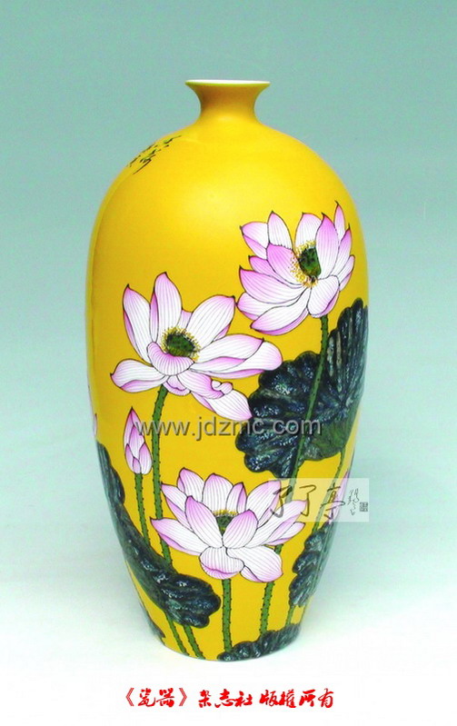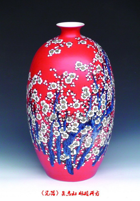 《瓷器》:现在圈里圈外的人一提到您,都会想到一个词,中华红。近年来,你似乎对于颜色釉的研究情有独钟? 宁勤征:中华红我是用了5年的时间才研制成功。中华红属于高温颜色釉,它的特点是红得饱满纯正,光亮如镜、鲜艳大气、灿若骄阳,象征着喜庆和吉祥。作品一经推出后,艳惊四座,获得了各方的高度关注,受到市场的青睐和追捧。 高温颜色釉作品千变万化,充满了神秘的不确定性和高难度的挑战性。 高温中华红颜色釉陶瓷作品,是我在多年的研究、探索、自主创新、开发、绘制出来最具时代风采品种之一。是以绘、刻、堆、填、涂等多种工艺手法相结合,运用多种高温颜色釉有机搭配,综合在一件作品整体当中,再历经1330多度高温还原焰烧制。 其中的代表作品有《映日梅花香更浓》、《独立春风第一香》、《映日荷花香满塘》、《秋色如歌》等。