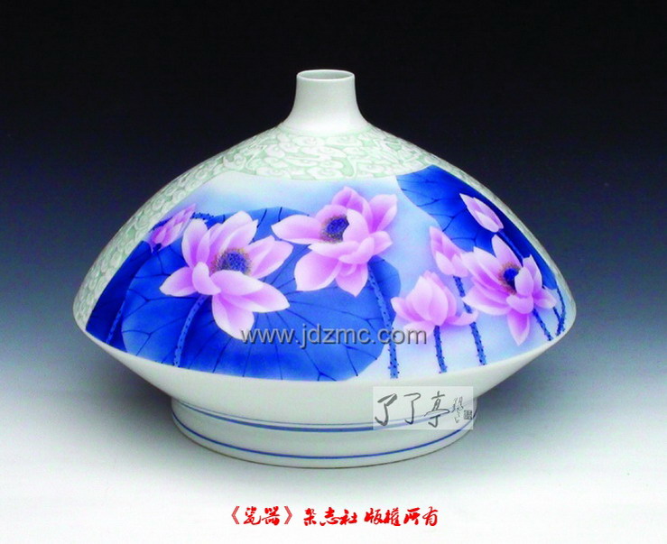 《瓷器》:怎么想到要尝试烧制出这样的一种高温颜色釉?作品试验成功后,为什么给它取名“中华红”? 宁勤征:我记得是在2000年,我到杭州参加“西湖博览会暨首届国工艺美术大师精品大奖赛”,第一次看到国内其它产瓷区的厂家带来的许多件大红颜色釉参展产品。 它们色彩红亮,颜色诱人,装饰绘制都是釉上彩。据介绍,这种大红釉瓷器叫“中国红”,是独家首创的陶瓷新品种,经过“素烧、釉烧、红烧、金烧”四次烧成,其它产瓷区根本烧不出。 红色向来是中国人最喜欢的颜色。在陶瓷史上,祭红瓷、郎红瓷从来都是瓷珍品。 杭州回来后,我就暗下决心进行一番尝试,烧制出比“中国红”更漂亮的作品。 我发现景德镇艺术陶瓷,除了在烧制好的白瓷胎上以釉上颜色钒红、珊瑚红作为底色,然后进行绘画装饰的艺术陶瓷之外,确实还没有直接用高温釉料在高温红底釉上作装饰、一次烧成的艺术陶瓷。景德镇的祭红、郎红釉也只能在烧制好的瓷器上进行釉上彩绘。 我就想,能不能创造出一种比祭红、郎红更稳定的红底色釉,又可在其釉面上进行绘画创作,然后经高温一次烧成的陶瓷艺术品呢? 为了证明景德镇能烧制出红亮纯净的高温红色釉瓷,并且要在工艺烧制难度上领先,我从2001年开始独自研制高温华红颜色釉陶瓷作品。由于红色在高温条件下很容易分解,极不容易成色,我遭遇了多次失败。 先后试验了几百块陶瓷“照子”瓷片。那时,我常常骑着摩托车在景德镇各个制釉作坊遍寻各种原料,并先后试验了几百块陶瓷“照子”瓷片。整整4年后,我终于能够大致掌握烧制高温华红颜色釉瓷的要领。 当第一件中华红作品烧制成功时,我真的激动得难以形容。这种红雍容端庄大气成稳,非常漂亮,我该给它取个什么名字呢,我点起烟,抽了一根又一根,无意间,我瞟了一眼我手中的红中华香烟,有了,就叫中华红!这个名字就是这么来的。