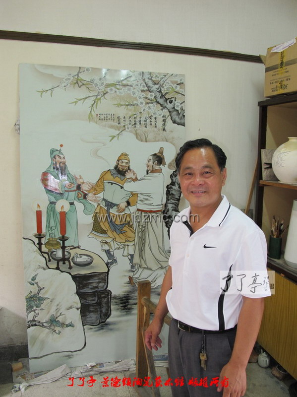 《桃园结义》源出自《三国演义》,是曰“刘备、关羽、张飞三人,于涿郡张飞庄后之桃园,备下乌牛白马,祭告天地,焚香再拜,遂结为异姓兄弟”之事,为民间家喻户晓、妇孺皆知,故文人多以此题材入画,以寓“不求同年同月同日生,只愿同年同月同日死”之兄弟情谊。兹瓶形制敦稳饱满,腹上以新彩施绘“桃园结义”之境象,画面布置得宜,运笔兼工带写,人物形神并茂,真栩栩然欲话言。细观其线条,衣纹顺然流畅,遒干苍润老劲,轻重缓急,抑扬顿挫,用惟其宜,施得其当,令人观之豁然解颐。此作尤可贵处,是以西画之色托衬传统笔墨之道,面目清新,笔力卓绝,允称“汲古铸今、融西汇中”之翘楚。 视频连接地址:http://www.tudou.com/programs/view/ER6N9W3gXN0/ 沈浮的创作室的确很简单,在省所二楼,一间10平方米左右的工作室,没有任何的装修,只有几张桌子和1个橱柜,由于时间长久,几件家具上都粘渗了涂料的颜色。