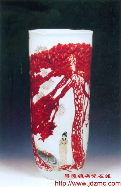 这是王采人物最具创意之处。关于“小写意”,在理论上古人也曾有过论述,如清朝郑绩在他的《梦幻居画说简明》中就讲到:所谓逸者,工意两可也……,话虽这么说,但在陶瓷上作“小写意”并非没有难度,一是位置经营,尤其是青花与粉彩的结合,在器型的展面、色彩的处理、布局的疏密及运笔的势度,往往有个“时间差”的磨合过程。二是意与工乃两个极端,结合不当,则两败俱伤。王采在实践中摸索出了自己的一套路子,循“树为君,人随之”的传统理念,意笔写景、工笔写人,故能工意适度,相得益彰。他的《清风图》瓷板画,大笔扫绘出翠竹数竿,意到笔不至,却细笔勾描出村姑扶桃而立,当工则工,当意则意,自有一种放松自如、意韵横生的效果。应该指出的是,王采曾攻习过素描写生,也研习过国画临拟,这为他改造陶瓷传统工笔人物画提供了基础功底,也正是他今天成功之处的得益所在。