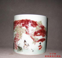 有人说王采的瓷画喜拙不喜巧,喜怪不喜平,喜简而不喜繁。确切地说,王采是极少有传统工笔人物的画作。但他的陶瓷绘画无不渗以古人的勾、描、晕、染之法,而且深蕴其父锡良的造诣真谛。其作品打破了传统画景的内敛式的构图法,往往在镶器纹饰的布局上使主体画冲出边框形式作大开大合、大争大让的外张式的延伸,使得画面有“平中见奇、画断景联”的展示效果,有了“空、虚、远、近”的纵型的空间感。其次落笔以简代繁,以少胜多的处理,此中又不失保留一股天趣拙味,笔意之间恰到好处。《得意图》写一高贤隐士在紫云笼荫下、奇石怪岩旁饮酒自得的情景。有人称赞为“极为意味”。这种意味既对人物形体、形象特征的点划,也有对环境、气氛及衬景的规划,而这些都在王采简繁之是的控制之中。隐士的醉酒而狂歌,侍童的斟酒而乏力,无不通过寥寥数笔取代了工笔斤斤营营的形体刻画,经过艺术的取舍并通过技能完好地表达出来了,使画者与观者都由此产生审美心理的共鸣。