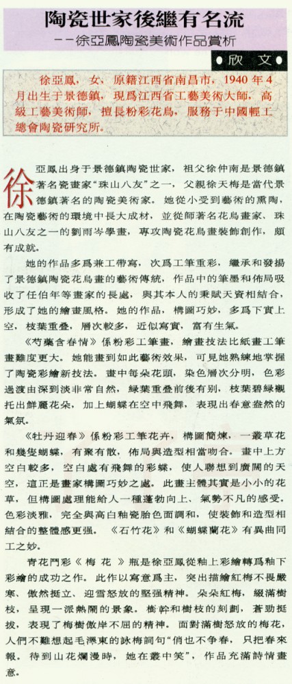 徐亚凤,女,原籍江西省南昌市,1940年4月出生于景德镇,现为江西省工艺美术大师,高级工艺美术师,;擅员粉彩花鸟,服务于中国轻工总会陶瓷研究所。
