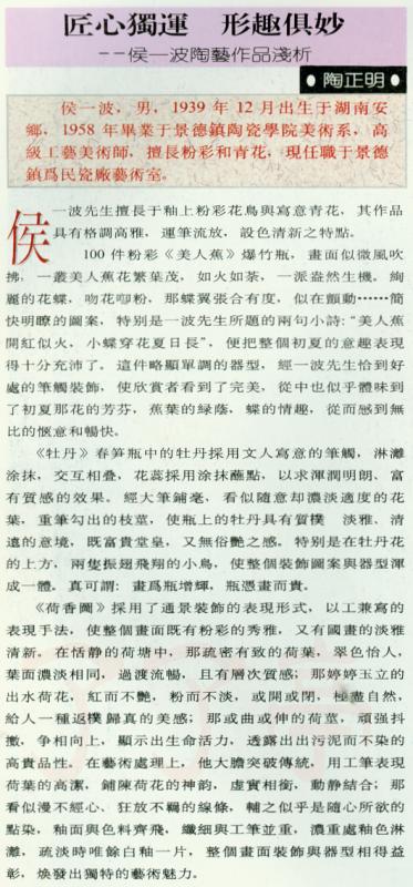 候一波先生擅长于釉上粉彩花鸟与写意青花,其作品具有格调高雅.运笔流放,设色清新之特点。