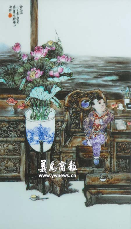 稚趣的孩童,从案几的书本上移目远望,似有所思,粉嫩的脸颊透露着若有所获的满足,任凭窗外云黑雾重,风雨欲来,在祥和的氛围里仍然享受着童年的幸福。这种感受来自心灵的深处,看似对家庭幸福的诉求,其实也是对现实社会的理想期望。和谐是当今中国发展的时代要求,饶晓睛用来自童年的感受,用陶瓷艺术,表达着时代的精神。“耕读”是创业的源泉,和谐幸福是“耕读”寄托的目标。