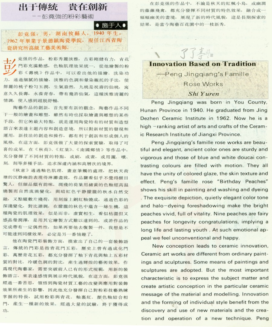 彭竟强的作品,粉彩秀丽淡雅,古彩刚健有力,青花斗彩充满动感,色釉肌理效果统一。从他绘制的粉彩《寿桃》作品中,可以看出他的描绘、洗染功力。通过细腻的描绘.淡雅的色调和晕染衬托的手法,使鲜丽的桃子粉匀玉润,生气盎然。九桃是祝寿的仙桃,寓意久久长寿,永葆青春,带有几许仙气,这种淡雅清丽的情调,使人感到超脱舒畅。