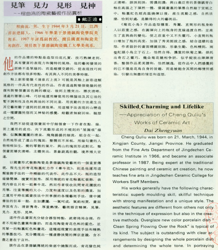 程曲流。男,生于1944年3月21日,江西省新建县人, 1966年毕业于景德镇陶瓷学院美术系。1987年评为副教授,擅长国画和陶瓷美术创作。现任教于景德镇陶瓷职工大学美术系。