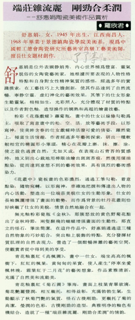 舒惠娟是位外表娴静娟秀,内心世界极为丰富、灵气脱俗的女陶瓷艺术家。她根据所要表现的人物性格特点和自身对女性精神气质的感悟,经过多年的实践摸索,在工艺技巧上大胆创新,使其作品达到了自然流畅、宁静空灵.虚幻神化的艺术效果。其笔下的仕女形象生动灵气,栩栩如生,光彩照人,充分体现了材质的特点以及作者对色釉。造型操作的娴熟和高超的绘画技艺,