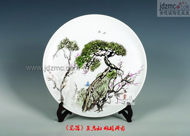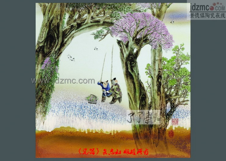 “日暖牵风”瓷板属高温窑变加彩,画面给人浪漫的遐想,仿佛置身于其中,给人空旷之美,整个效果区别于传统题材的表现,更具时代感。作品和窑变的结合相辅相承,构图疏密,留白讲究,处理得当美不胜收。其中树形婀娜、挺拔,意到势连。孩童活泼,形态可人,飞鸟增添动感,作品描绘了孩童的天真可爱的戏耍,寄以对美好童年的回忆。