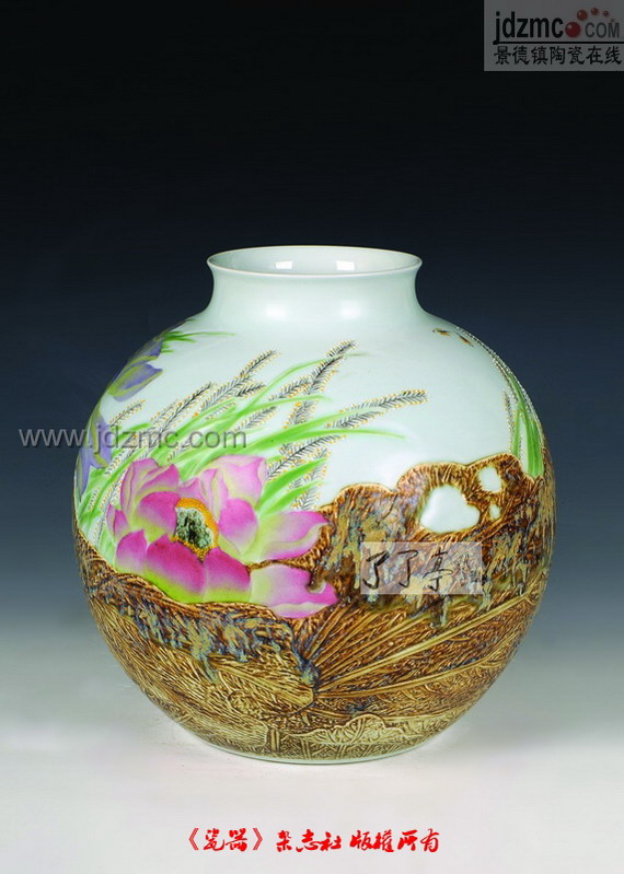 “风荷”综合装饰瓶,荷意为“和”,自古以来多少人赞美它,描绘它,是一种品格,更是一种境界,高温窑变的荷叶自然,强烈和加彩的荷花、水草产生了粗犷和细腻的对比,其中蜜蜂、水草的处理产生了动静效果,使作品更具视觉效果和意境之美。