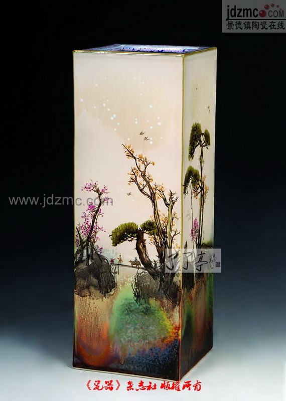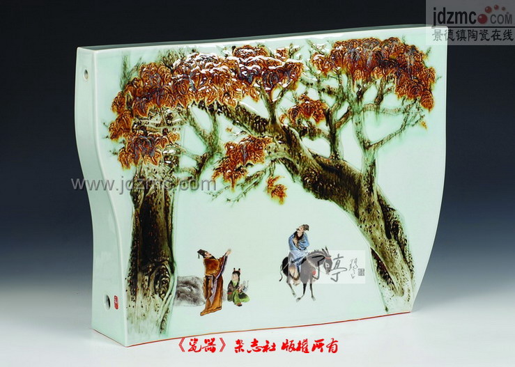 “秋望”作品采用色釉综合装饰手法,由高温色釉、雕刻、粉彩、新彩加以完成,整个构图给人格调高雅、考究之感,具有装饰性和时代感,有新意。在造型上打破传统镶器造型,且有动感。装饰为二面,其一表现对朋友再次相逢的一种期望,人物动态生动,以酒相送,依依惜别,神态感伤,寄情于景,让人释怀。另一面以琴抒发情感,其中妇女儿童都为之琴声而留步,聆听,表达了琴者对晚辈的希望,其中树形姿态、树叶的处理疏密得当,且有艺术效果,整个作品有瓷味,充满了诗情画意。