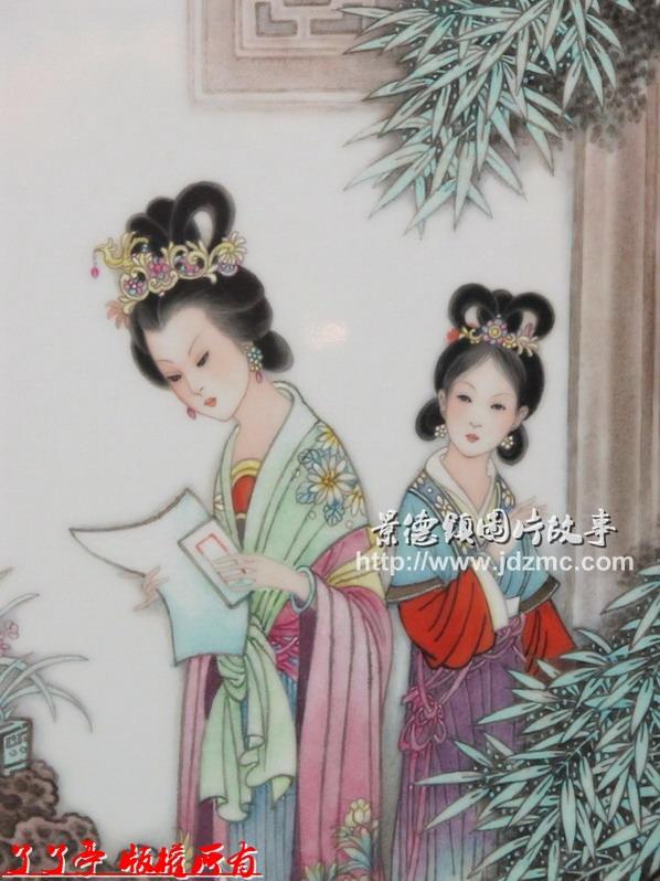 張松茂於2005年創作的粉彩《仙女湖》瓷版畫,畫的是江西省新余市仙女湖的自然景色。晝面近景以綠色為主,近樹為深綠,遠樹為淺綠,遠山為灰綠,就連水中的倒影、碼頭的地面也是淡淡的綠色。在萬綠叢中偶爾有點點黃葉,遊人衣服的黃、紅等色點綴,使畫面色彩既豐富和諧,又增加了晝面的活力。這幅畫使人彷彿來到仙女湖,有身臨其境之戚。