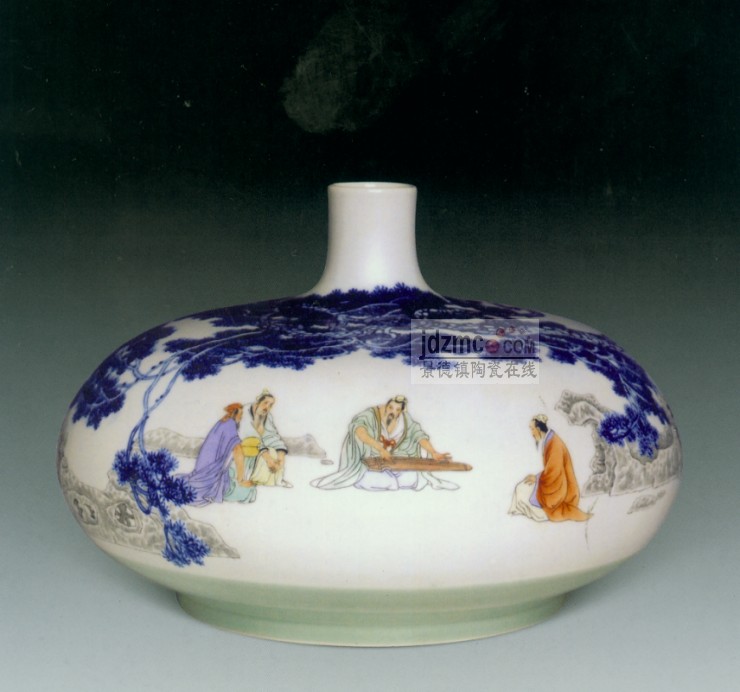 王懷俊創作的青花鬥彩《對弈圖》瓷瓶,晝面上用青花表現的松樹佔據了很大空間,它以半包圍的形式圍繞著主體人物,突出了主體人物,從而給人一種很溫馨的感覺。三位高士端坐在用紅色和黃色表現的山地上對弈和觀棋,空中幾隻小烏在飛舞,山坡下山泉在潺潺流淌。這件作品表現了人與自然的親近和諧。
