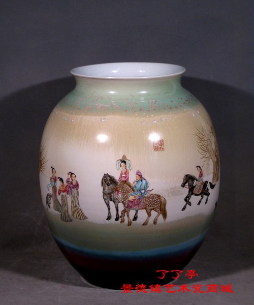 2006年,李文躍創新的粉墨彩《曲阜三孔》瓷缸,口沿及頸腹部和足部分別以影青刻畫蟠龍紋和蓮花紋為邊飾,具有莊嚴、凝重的民族底蘊。腹部的主飾以三孔地貌為景,通景長卷式構圖裝飾,孔子的聖績如“ 杏壇講學”等景物活動穿插其間。晝面運用粉墨彩繪畫手法,墨彩勾勒孔府孔廟的宮閣亭榭, “界晝”嚴謹,建築隱露有序;粉彩裝飾的人物百餘人,行坐立舞,可謂形神兼備。庭院曠野處的松柏柳桃及山石河壑,極富鮮明的地域性及時令咸。其筆勢精細,敷色高雅。作品器型之大,繪畫之精,彩類間綴之妙,文化底蘊之深,為當今瓷苑所罕見。