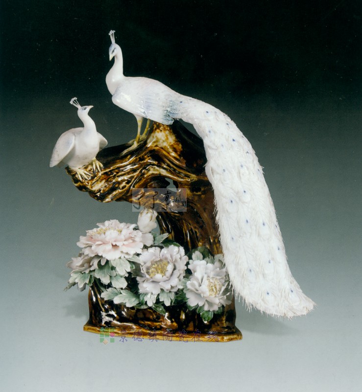 其次,在色彩上大膽地採用色釉、色泥、釉下五 彩、青花等裝飾材料及方法,使捏雕的風貌由單色(素 色)向彩色發展,豐富了捏雕的表現手段,增強了藝術 表現力。如捏雕《孔雀牡丹》 ,以烏金釉裝飾的山石 為陪襯、以花頭為釉下彩裝飾的白牡丹作點綴,突出表現白色孔雀的美麗。特別是最能顯示孔雀美的羽毛製作:細如絲髮的羽毛一根一根捏掛上去,細而不亂,十分精美逼真,把捏雕的語言發揮得淋漓盡致。整個作品色彩鮮明、色調和諧,並能把高溫色釉、釉下彩與捏雕特種技法巧妙完美地結合在一起,充分體現了陶瓷的材料美,令人歎為觀止。
