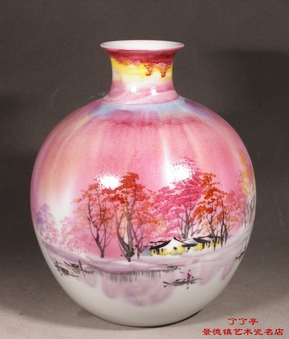 賴德全創作的潑彩《山川夢幻松濤雲韻》瓷瓶,晝面峻崖峭壁、蒼松秀木、瀑布飛瀉、山川雲煙繚繞、氣象萬千、真如夢境一般,晝面鬱鬱蒽蔥、流水潺潺,幾片用紅顏色點染的紅葉,與大面積的綠水青山產生強烈對比,十分醒目,使整個作品生動異常。這件作品既表現了作者對祖國山河的熱愛,也展示了作者出眾的才墓。