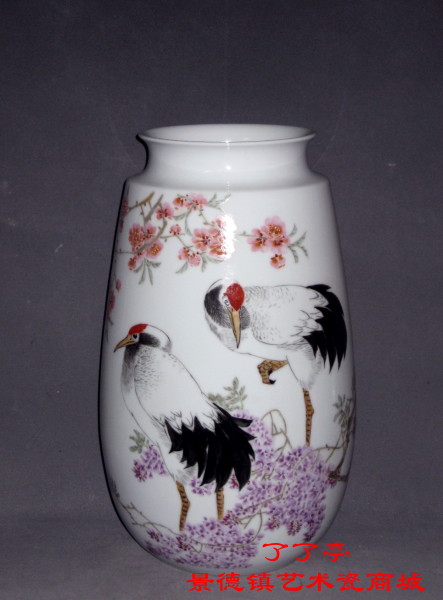 劉平於2001年創作的粉彩《鶴守寒梅》瓷板畫,畫面上鶴姿以線勾形,筆簡意賅,準確生動;梅枝縱橫穿插,梅花多而不亂。作品構思精巧,筆法概括凝練,晝面設色素雅高潔。作者讚美了鶴和梅不畏嚴寒、堅忍不拔的精神氣質。