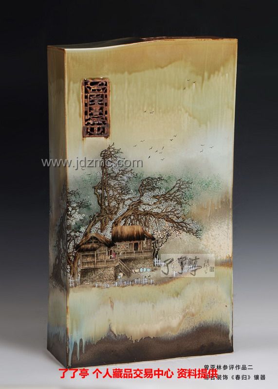 了了亭 景德镇陶瓷艺术馆 资讯: 从小就颇有天赋的曾亚林,16岁便能临摹白雪石4米长的国画《漓江新春》。他先后师从景德镇陶瓷学院教授姚永康先生、著名传统瓷雕家陈梦龙先生,学习传统雕塑,与最传统的工艺打交道。1980年参加工作后,他逐渐开始接触陶瓷,在1993年进入市陶瓷研究所后,由陶瓷雕塑设计转为从事陶瓷绘画。他幸运地师从中国工艺美术大师熊钢如先生,并赴景德镇陶瓷职工大学深造。从瓷泥到最后的作品烧制成瓷,他皆能独立完成,在陶瓷艺术界 的艺术家中,亦属不多见。