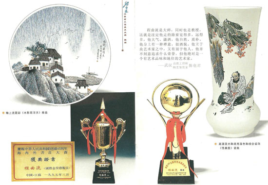 程曲流的陶瓷艺术创作,造型能力强,技巧熟练老到,手法新,对人物、风景、花鸟装饰颇有造诣。他善于运用高温色釉、釉上油料去达到某种肌理效果,其作品具有丰富的表现力和独特的风格,“手法简练、结构准确、形象生动、色彩调予明快概括,清新而有生气”。程教授的陶瓷美术作品和国画作品多次在美国、法国、加拿大、日本、新加坡、泰国以及中国港澳特区和台湾等地举办个人展和联展,并被一些国家的馆藏机构及收藏家收藏。除此之外,程教授也曾在50多个国家级、省级、海外出版社、报刊杂志上出版发表艺术作品3000余件、绘画专著两本.其作品曾荣获“庆祝建国45周年海内外书画大赛”绘画金奖、“第五届国际书画作品展览”金奖、纪念联合国教科文组织五十周年“世界和平友好国际书画大赛”优秀奖和“第三届祖国颂国际书画摄影大赛”特等奖等各类奖项30余次,曾荣获“98全国百杰书画家”、“国际金奖艺术家”、“世界铜奖艺术家”等诸多称号。其传略简介已入编《世界名人录》、《中国当代陶瓷艺术家辞典》、《瓷都艺星》辞书。
