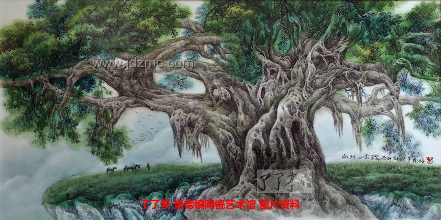 在不惑之年,他的作品,新意叠出,令人耳目一新,在画面中,我们仍然可以找到彭荣新在陶瓷领域长久熏染的强烈的装饰感和设计感,这体现在题材的把握上,重视整体的效果和表现力。我们同时又在画面中感到了强烈的视觉冲击力,那是因为他具有很强的绘画基础和写实能力,善于捕捉大自然中的真、善、美,更为重要的是,他在题材的选择上,有了自己独到的视角。《好大一棵树》其中的代表作,他用写实的手法,绘就了一棵参天且硕大的榕树,榕树苍劲挺拔,枝繁叶茂,蔽天遮阳。在榕树的荫蔽下,空旷的绿草丛中,放牧的牛与牧童显得是那么的遥远,甚至微小,而远方的天空群鸟展翅飞翔,更是宛若星辰点点,树根深处是浅浅池塘,池水清澈透亮,几只白鸭在水中尽情嬉戏。好一派悠然自得景象,是桃花源的新版诠释。