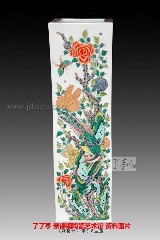 技艺特点 本人继承和发扬了康熙古彩风貌,古彩是中国画和图案结合的一种装饰艺术,它具有鲜明的本土地域特色,是景德镇独有的釉上彩绘艺术。 作品特点:形象大胆夸张变形,具有装饰趣味。有的构图丰满,有的简约、古朴、线条雄健刚挺,特别是千年老梅,用笔曲折变化,苍劲古拙,多用中锋,给人以节奏韵律的美感。善用排线与大小圆点的手法,来表现出山石、梅桩、花朵等的明暗肌理变化。用色一种是富丽堂皇,如《春色满园》花瓶,色彩对比强烈;一种是素色,清淡高雅古朴,如绿梅《梅林曲》大盘。