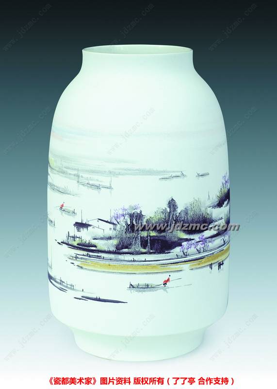 熊国辉的珍珠釉墨彩作品大多以山水为主,《韵·江南》为其代表作之一:若隐若现的远山、芳草萋萋的滩涂、渔夫摆着小船荡漾在平静的水面、依山伴水的小村庄安详宁静……勾勒出一幅世外桃源般的山水风光。除了在个别地方运用了彩色,整个画面基本上以水墨为主。笔者问熊国辉:“为什么要点缀彩色?全部用水墨也许意境会更好一些。”熊国辉淡淡一笑,答道:“有一些人说全部采用水墨,画面会单调一些,于是我便听取了他们的建议。但我个人更加喜欢纯粹的水墨画面。”