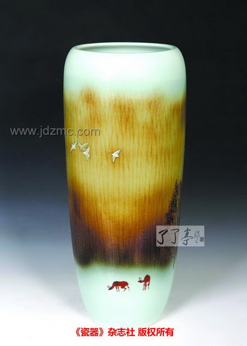 刘志为擅长高温色釉斗彩综合装饰及水墨青花,他的高温色釉作品色彩绚丽、色调明朗,画面犹如磨漆画般,既浓烈而又清新、既沉稳而又鲜活,在大的块面效果中又有精致的细节描绘,富有现代审美情趣。《秋韵》就是他的高温色釉点线面完美运用的佳作,以大块面赭褐和黄的釉色变化营造金秋的氛围,用简捷的线条使有枝干无片叶的秋林极具装饰性,与对面超自然色彩的红树形成鲜明对比,又以横亘其间的由白、灰色釉点染的水气间隔通透,使画面韵味悠长。在背景气氛做足之后,白羽灰翅的南飞候鸟登场了,整个画面顿时灵动起来,颇有“画龙点睛”之妙。