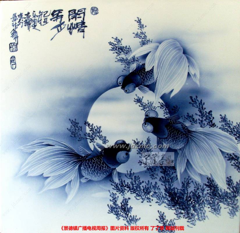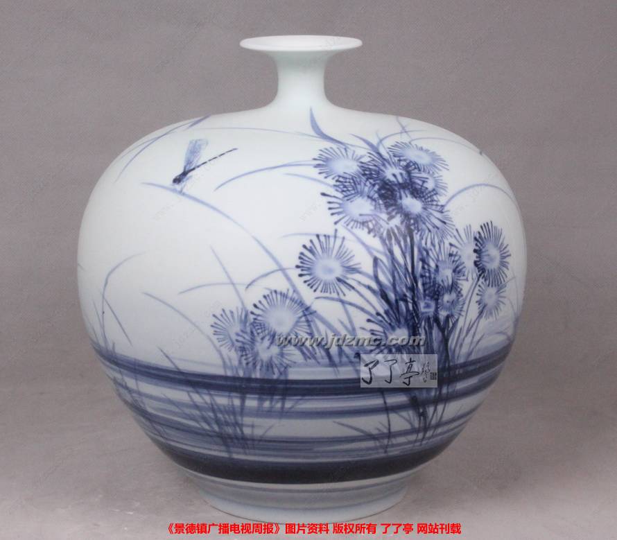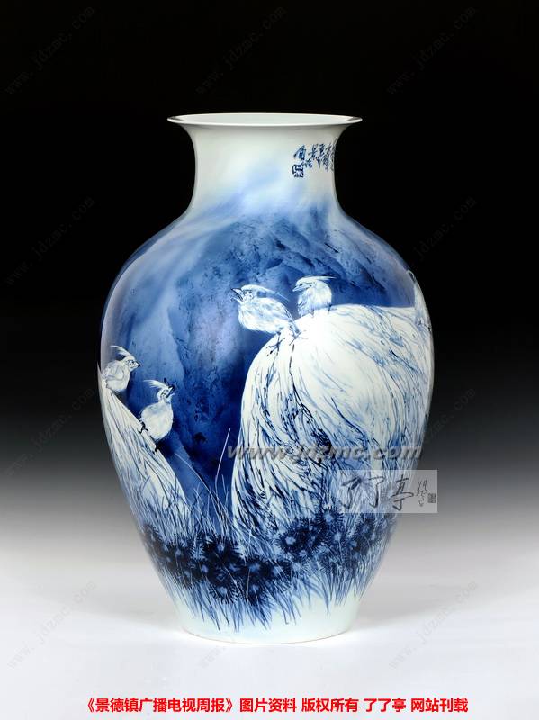 吴志辉:纵观当今,影响最广的还当数黄卖九的青花,业内外人士都尊称他为“青花大王”。我觉得黄卖九把青花演绎得游刃有余,他的青花个性更加张扬,画艺更浓厚。他擅长粉彩,新彩,青花,青花斗彩,青花釉里红,“半刀泥”刻划花。他长期研究和创作中国画,专长于花鸟,兼长于人物,动物瓷绘,对陶瓷器型设计,装饰设计均有很深的造诣。他的粉彩花鸟笔触灵捷,形成兼工带写,明快雅致的格调。他的“半刀泥”刻花更是一绝,上秉宋代影青刻花以及清代雍正,乾隆时期的刻花技法,以刀法的深刻,画出具有强烈立体感的鲜明而精巧的各种艺术形象。 大面积的青花分水是青花技法上最难把握,也最能体现其高超技艺的一项操作。他在大面积的分水中,用墨酣畅淋漓,层次分明,犹似国画的“墨分五色”,含而不露,艳而不俗,淡而不薄,浓而不滞。