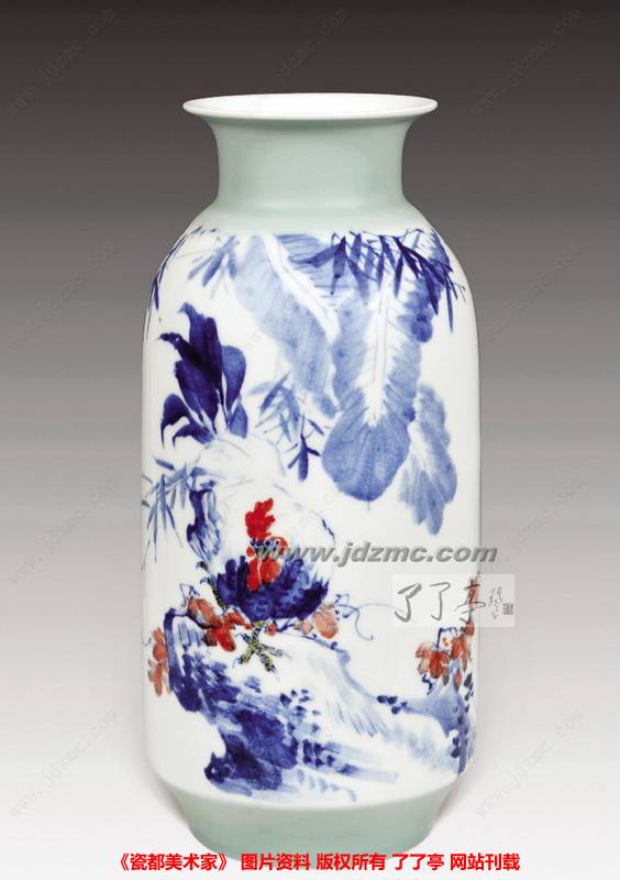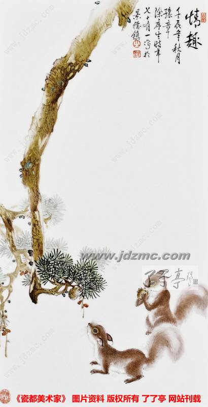 他(涂序生)创作的大型青花瓷板《松间情趣》,虽然题材和他的粉彩花鸟瓷瓶《松间情趣》一样,都是以林中精灵———松鼠为典型,但是在布局章法上却不同。由于瓷板的展面如同宣纸一样长宽,和在瓷瓶的凸面上设计布局不同,先生在创作中注重画面上的松枝虚实相间、疏密有致、参差不齐、布置有法;松林间的几只松鼠也是形态各异,各不相同;整幅画面布局精妙,结构严谨,达到了既有传统韵味又有现代气息的整体效果。