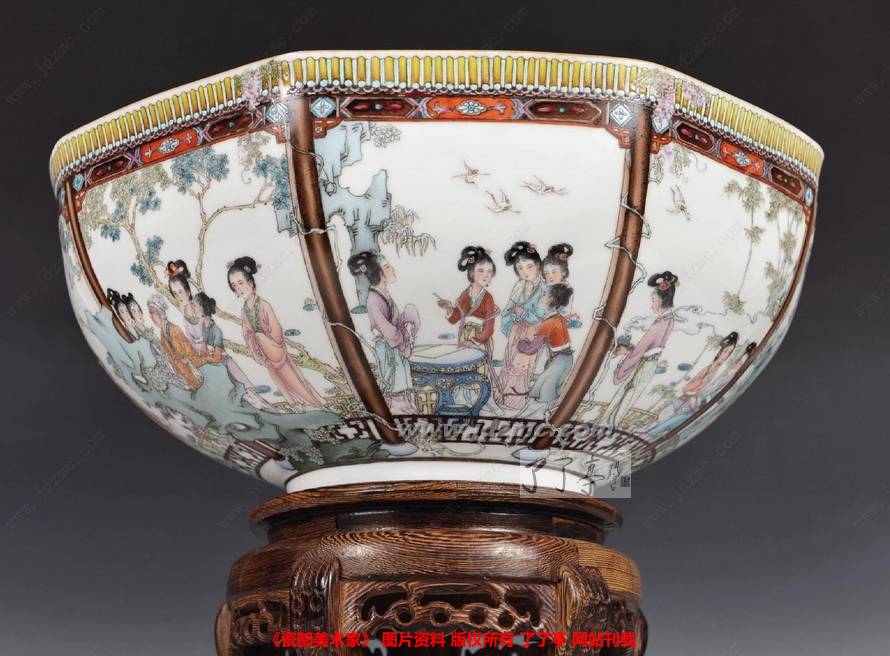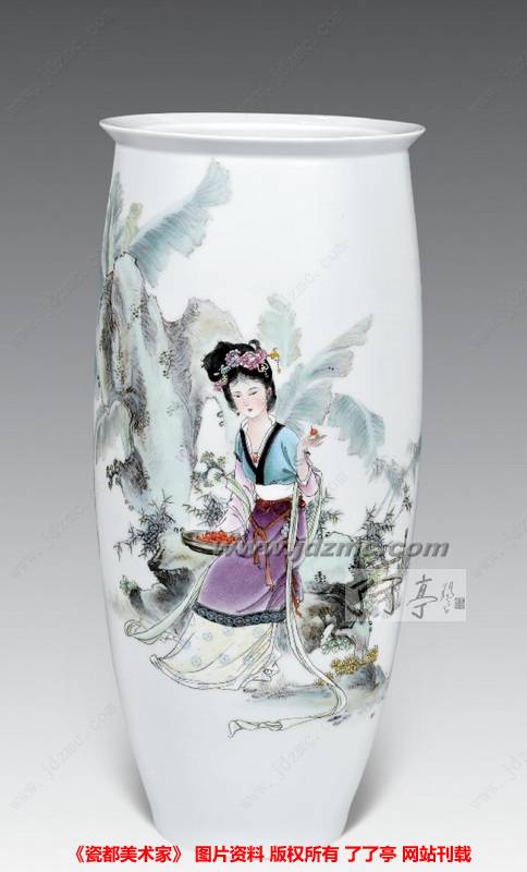 有一些文字则以具体作品为我们道出了涂序生的艺术造诣:涂序生在一只口径为28 厘米的八角薄胎碗绘画《大观园》时,就摒弃了布景进进营造的“明示式”,采用了长廊通景法而略去了上部的亭阁装饰。前景假山玲珑、紫萝飘曳、芭蕉吐绿,写“雨余春树荐樱笋,画桥紫陌踏香尘”的时令,中景绘宝玉偕十二金钗娱乐期间,或听琴、或观花、或赋诗、或品茗,人物形神个性鲜明;背景淡涉,天水一色,似南燕剪翅飞,如北鸥掠水起。整个画幅前实后虚,颇有深远感。人物布列以廊柱为界,主次分明。在有限的瓷碗展面上,以工写兼施的笔触,传统的粉彩色调,创新的构图形式,提示了“琴阮相与如,红尘大观园”的主题意蕴。这件作品现珍藏于景德镇陶瓷馆。