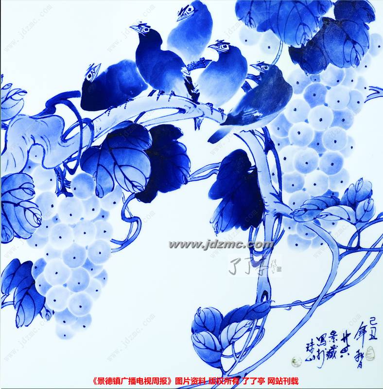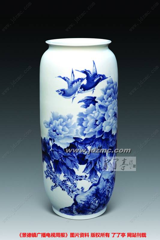 青花陶瓷是用氧化钴色料在未施釉的陶瓷胚胎上绘画,然后施釉一次性还原烧成钴蓝色画面的陶瓷,其魅力在于色调清新雅致,温润沉静,对比鲜明,永不褪色。正因如此,数百年来青花陶瓷艺术长盛不衰,成为独特而有魅力的艺术。中国工艺美术大师——青花大王黄卖九的青花分水,犹如中国画的泼墨写意画 ,显得大胆泼辣、气势磅礴,造就的艺术形象具有丰满,湿润,遒劲的艺术魅力。他的青花分水写意花鸟画精湛娴熟、技艺非凡。他在坯胎上纵横驰骋,"料分五色",把人们带进了一个纯净美好青花世界。