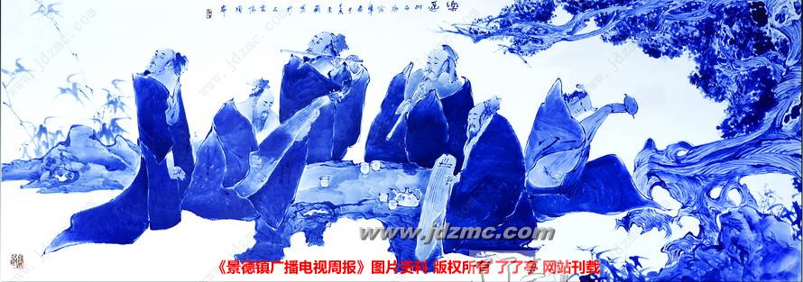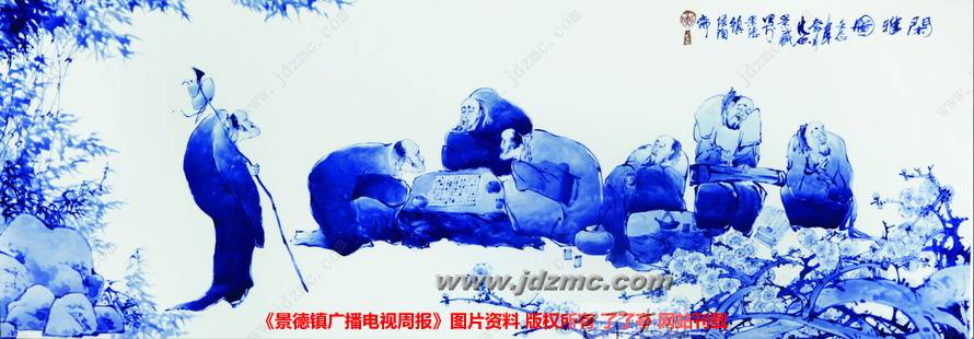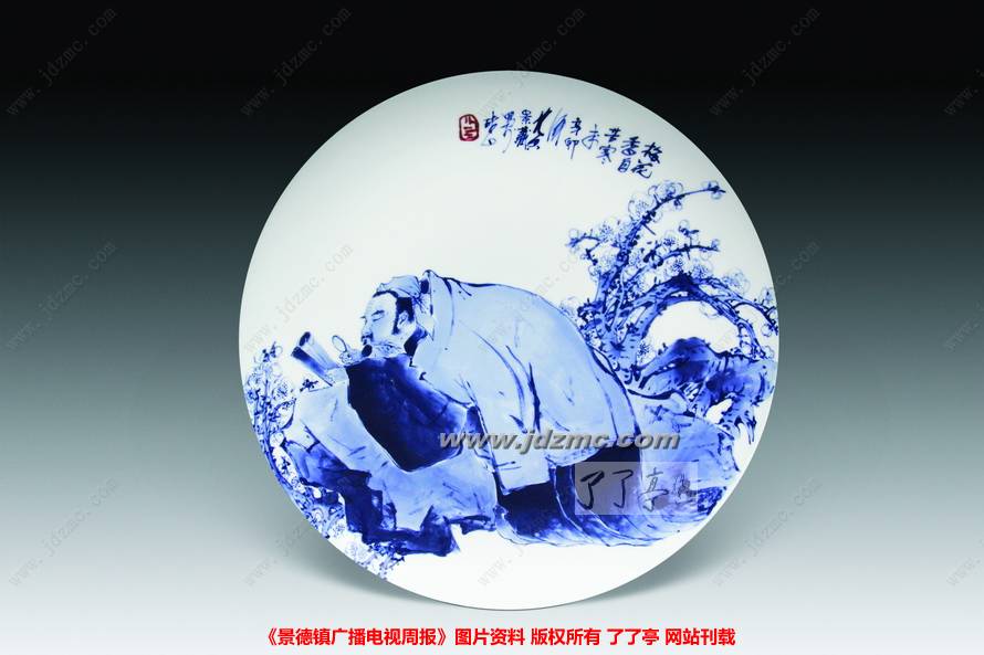 众所周知,陶瓷人物画在当代陶瓷艺术中占有重要的地位,无论在发展空间上,还是创作难度上,人物画是陶瓷艺术家永远不朽的创作题材。上世纪30年代名噪一时的“青花大王”王步,虽然首创借鉴中国水墨画技法创作青花,从王步先生所处的年代过后,父亲黄卖九在继承王步先生的基础上,开创了青花分水花鸟画法的新篇,他的鲶鱼、荷花、紫藤等花鸟瓷画,都成为景德镇青花艺术的传世佳作。而青花分水技法运用在陶瓷人物创作上,数十年来在景德镇还少有人去大胆尝试过。黄景藏在十几年前就有了这样的想法,并投入分水青花人物瓷画的揣摩与研究中。多年来他不断尝试,画了许多分水青花人物作品。虽然经历了很多失败,但黄景藏依然不改初衷坚强跋涉,到后来他越画越有感觉,最后他居然彻底扔掉花鸟瓷画,全部精力用于青花分水人物瓷画创作上。
