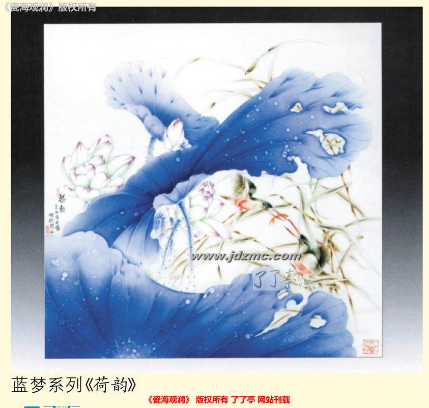 在这一段时间内,胡文峰创作了一批这样的作品———立足于中国传统绘画的工笔或写意,但却又融入了大量的装饰技法,特别是大胆地调用了与题材景物似乎不相关的蓝色,使一件件作品潮流时尚而不失传统,淡雅依然但视觉效果明显。例如她的釉上彩瓷板《国色天香》,下面的四分之一是传统工笔技法的牡丹绿叶,接着大胆地以盛开的淡蓝牡丹向上延伸,两只深色蝴蝶翩翩起舞于其上,生机顿现,让人感觉清新悦目,特别是至顶部的渐淡近无,使得整个画面饱满充盈而不显密匝添堵,满图布局的装饰画面仍然达到了疏密有致的效果;再如她的釉上彩瓷板《晨梦》,写意笔法绘就的花草以装饰技法密排于瓷板下部,两只蝴蝶起舞于右上,整个画以蓝为主基调,给人以视觉之美,一横一竖的两次黄金分割,使得画面灵动鲜活、美感无限;釉上彩瓷板《晨曲》笔法、技艺、构图等与《晨梦》都非常相似,而其中两中似有若无的蝴蝶既增生机,又不影响上半部分的空旷,可谓匠心独具。这就是胡文峰的“蓝梦”期作品,风格凸显让人过目难忘。