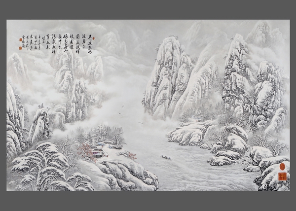 画雪景山水,宋人以范宽为首,千古之下,无出其右,可见雪景山水之难写。瓷上雪景更是如此,不仅要有娴熟的山水画功底,还要有借地为雪,借云作雨、借空作雾和黑白相衬的霄最绘画技巧。才能较好的画出冬雪茫茫厚实、寒气逼人,春雪融融欲尽,春风送暖或雪后初晴、万物复苏的真实感。