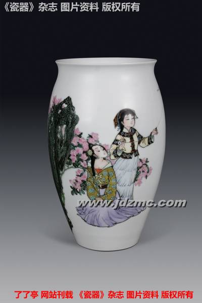 在这里,好学上进的舒惠娟全面尝试了釉上、釉下工艺技法。新彩、古彩、青花釉里红、颜色釉装饰、陶艺等她都能上手,可以说广泛接触了陶瓷装饰的所有门类。在不断的学习摸索中,她确定了釉上创作的主攻方向,并就陶瓷油料的配比进行大量试验研究。她震撼于油料在陶瓷表面产生的神奇肌理效果,情有独钟地将研究所得大量使用于人物、山水作品中,这种独特的创作风格也逐渐成为她艺术创新和自我风格的标志。