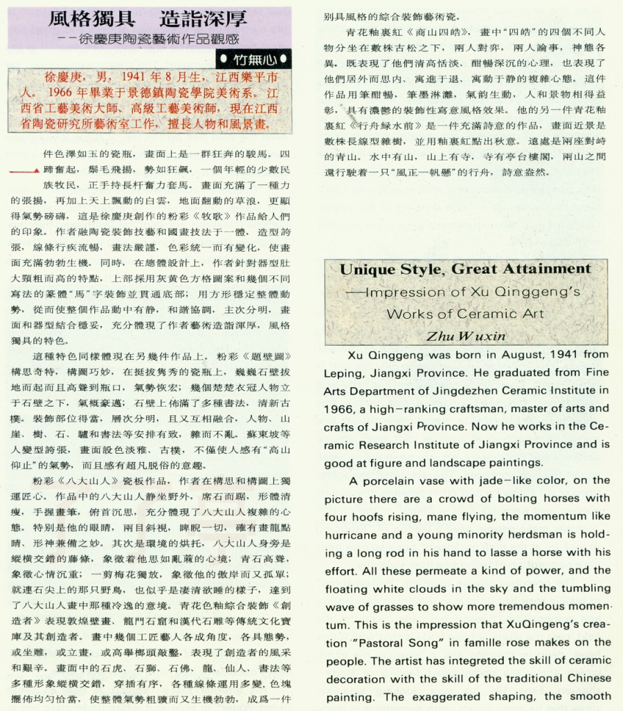 | 风格独具造诣深厚—徐庆庚陶瓷艺术作品观感 95年资料 | |||||
