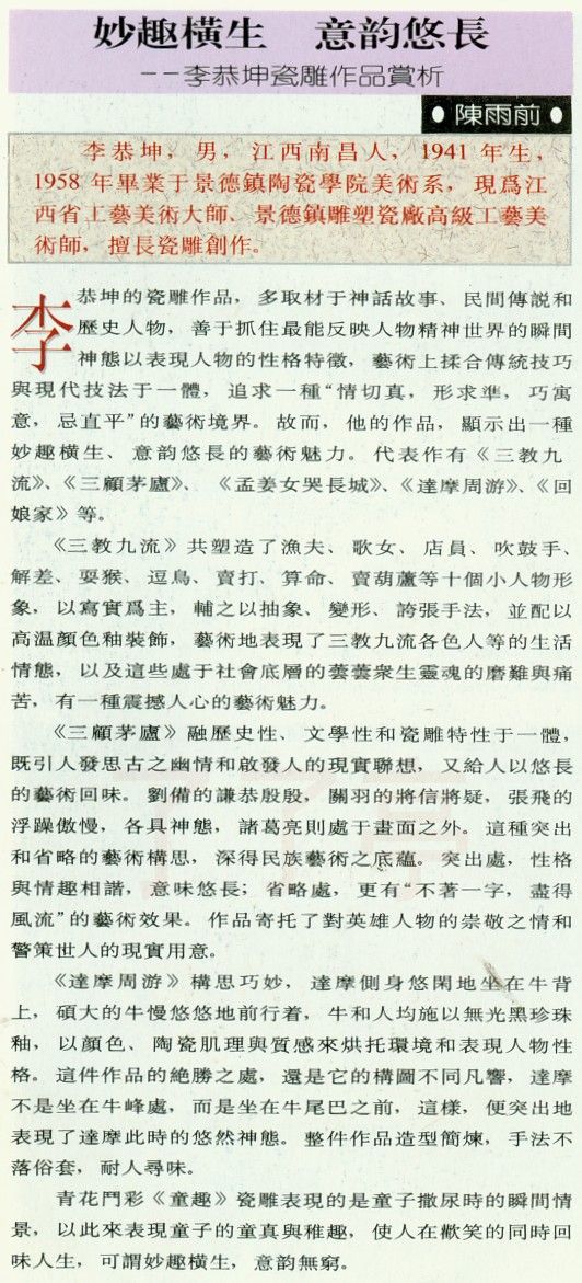 | 妙趣横生意韵悠长—李恭坤瓷雕作品赏析 95年资料 | |||||