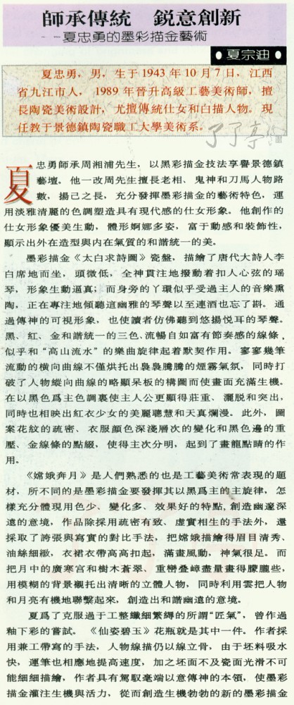夏忠勇,男,生于1943年10月7日,江西省九江市人, 1989年晋升高级工艺美术师,擅长陶瓷美术设计,尤擅传统什女和白描人物。现任教于景德镇陶瓷职工大学美术系。 夏忠勇师承周湘浦先生,以黑彩描金技法享誉景德镇艺坛。他一改周先生擅长老相、鬼神和刀马人物路 数,扬己之长,充分发挥墨彩描金的艺术特色,运用淡雅清丽的色QBg塑造具有现代感的仕女形象。他创作的仕女形象优美生动,体形婀娜多姿,富于动感和装饰性,显示出外在造型舆内在气质的和谐统一的美。 墨彩描金《太白求诗圃》瓷盘,描绘了唐代大诗人李白席地而坐,头微低,全神贯注地拨动着扣人心弦的瑶琴,形象生动逼真;而身旁的丫环似乎受过主人的音乐熏陶,正在专注地倾听逭幽雅的琴声以至连酒也忘了斟。通过傅神的可视形象,也使读者仿佛听到悠扬悦耳的琴声。黑、红、金和谐统一的三色,流畅自如富有节奏感的线条,似乎和。高山流水。的乐曲旋律起着默契作用。寥寥几笔流动的横向曲线不仅烘托出袅袅腾腾的烟雾气氛,同时打破了人物纵向曲线的略颐呆板的构圃而使画面充满生机。在以黑色为主色调裹使主人公更显得庄重、洒脱和突出,同时也相映出红衣少女的美丽聪慧和天真烂漫。此外,图案花纹的疏密、衣服颇色深浅层次的变化和黑色边的重压、金线条的点缀,使得主次分明,起到了画龙点睛的作用。