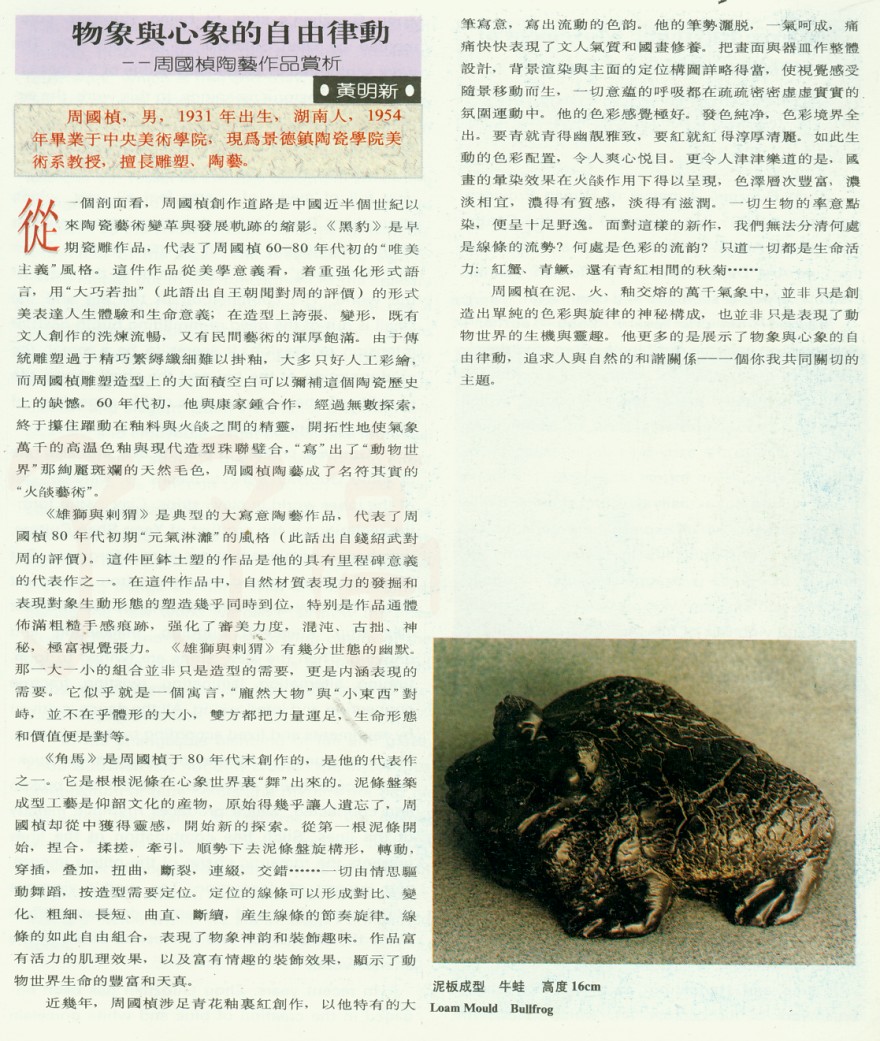 从—个削面看,周国桢创作道路是中国近半个世纪以来陶瓷艺术变革与发展轨迹的缩影。《黑豹》是早期瓷雕作品,代表了周国桢60一80年代初的“唯美主义”风格。这件作品从美学意义看,着重强化形式语言,用“大巧若拙”(此语出白王朝辟对周的评价)的形式美表达人生体验和生命意义;在造型上夸张、变形,既有文人创作的洗炼流畅,又有民间艺术的浑厚饱满。由于传统雕塑过于精巧繁缚纤细难以挂釉,大多只好人工彩绘,而周国桢雕塑造型上的大面积空白可以弥补这个陶瓷历史上的缺憾。60年代初,他与康家锺合作,经过无数探索,终于攥住跃动在釉料与火焰之间的精灵,开拓性地使气象万千的高温色釉舆现代造型珠联璧合,“写”出厂“动物世界”那绚丽斑斓的天然毛色,周国桢陶艺成了名符其实的“火焰艺术”。